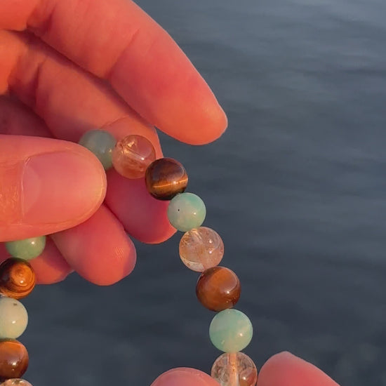 Ce trio crée un équilibre entre apaisement et élan vital. L’amazonite aide à retrouver la paix intérieure et à exprimer sa vérité, l’œil de tigre renforce l’assurance et la stabilité, tandis que la citrine dynamise et soutient les projets avec clarté et optimisme.