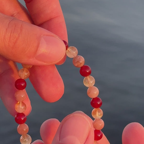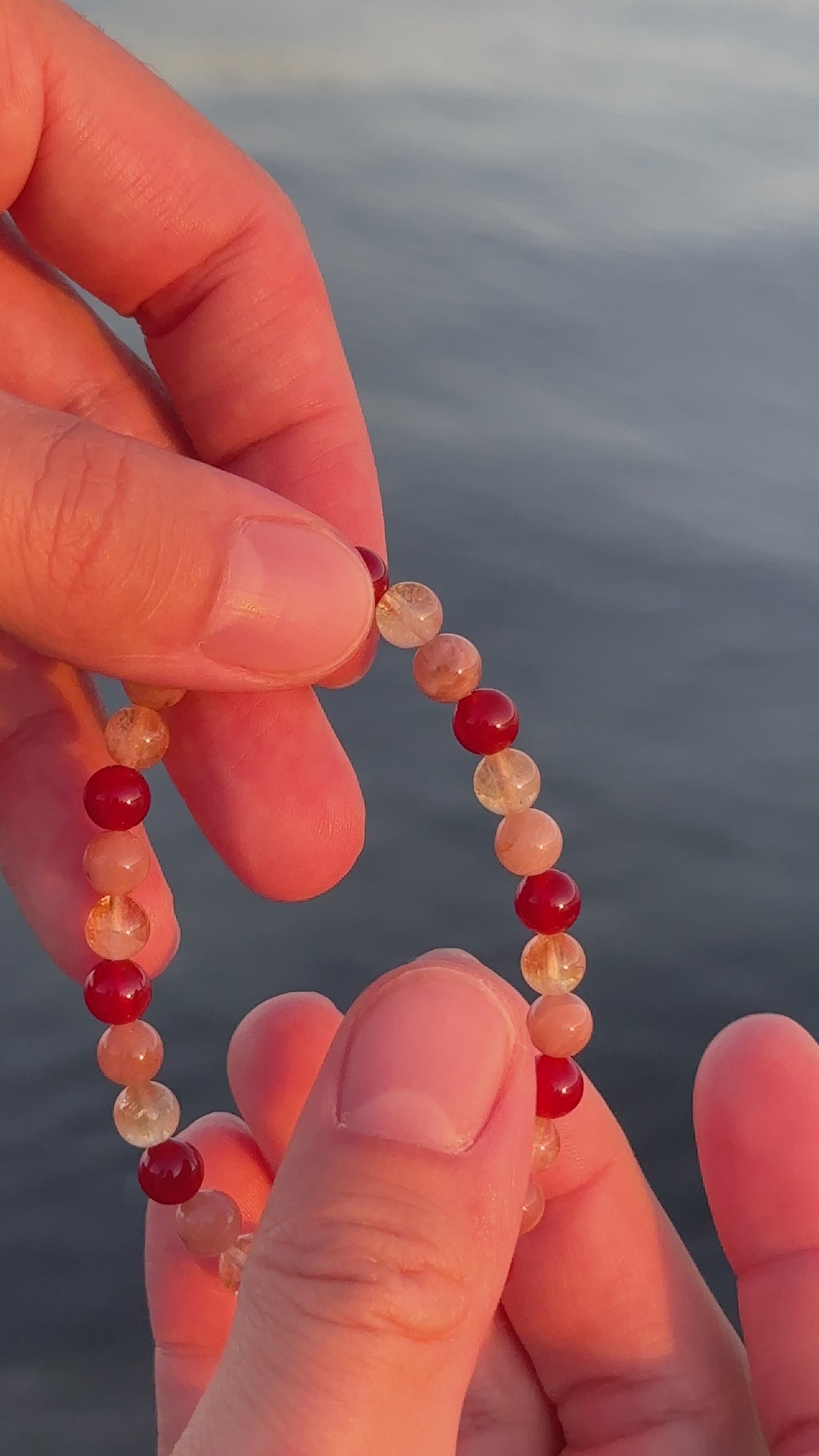 Un bracelet chaleureux et stimulant. La cornaline réveille la créativité et l'élan vital, la citrine chauffée favorise l’enthousiasme et la joie, et la pierre de soleil rayonne confiance légèreté. Une synergie pour oser rayonner pleinement.